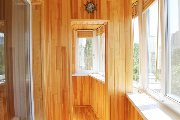 Внутренняя отделка балкона – деревянная вагонка из сосны.